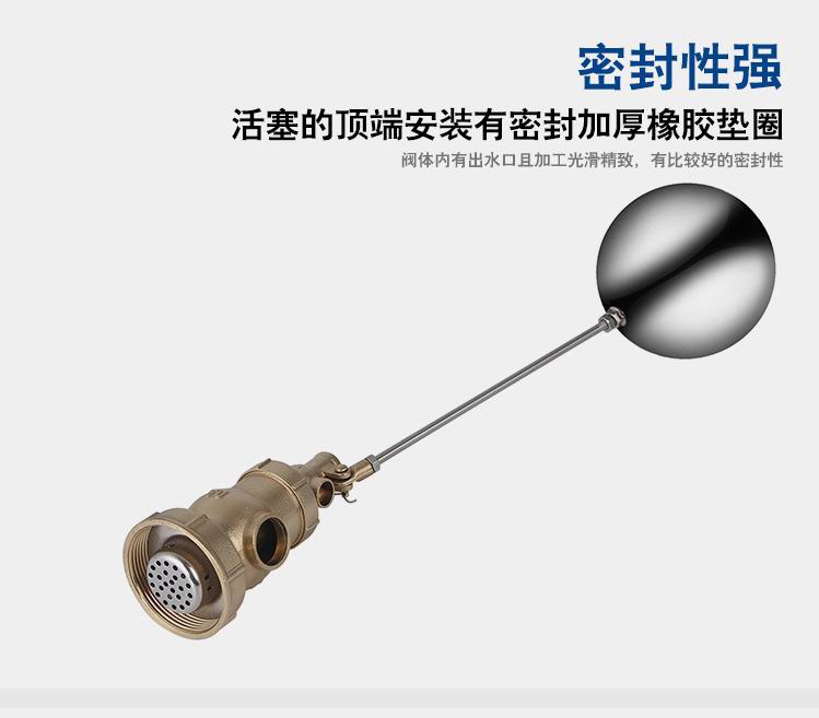 當(dāng)水塔內(nèi)水面下降時,浮球下落,利用水管內(nèi)水的壓力,將閥體里的密封硅膠柱塞打開,閥體開啟供水,當(dāng)水塔水位上升時,浮球上浮,連桿帶動柱塞,硅膠體密封進(jìn)水孔,閥體停止供水.