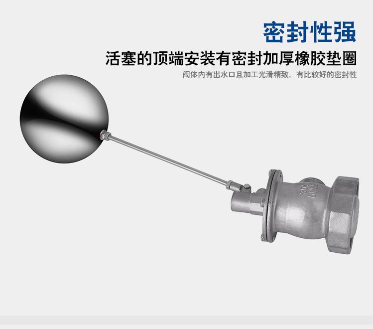 當(dāng)水塔內(nèi)水面下降時(shí),浮球下落,利用水管內(nèi)水的壓力,將閥體里的密封硅膠柱塞打開,閥體開啟供水,當(dāng)水塔水位上升時(shí),浮球上浮,連桿帶動(dòng)柱塞,硅膠體密封進(jìn)水孔,閥體停止供水.