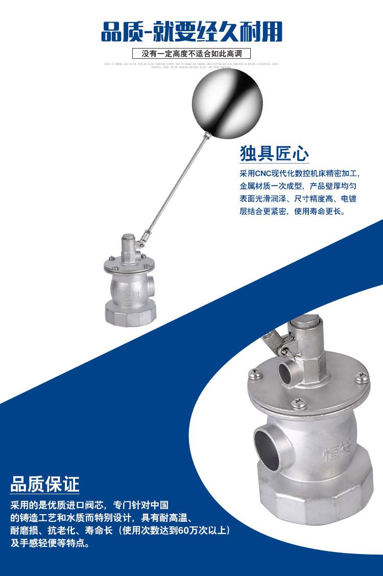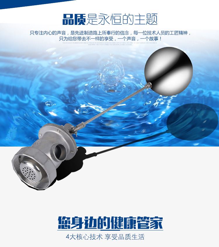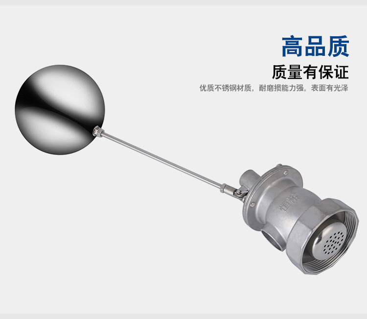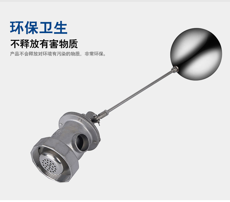 當(dāng)水塔內(nèi)水面下降時(shí),浮球下落,利用水管內(nèi)水的壓力,將閥體里的密封硅膠柱塞打開,閥體開啟供水,當(dāng)水塔水位上升時(shí),浮球上浮,連桿帶動(dòng)柱塞,硅膠體密封進(jìn)水孔,閥體停止供水.