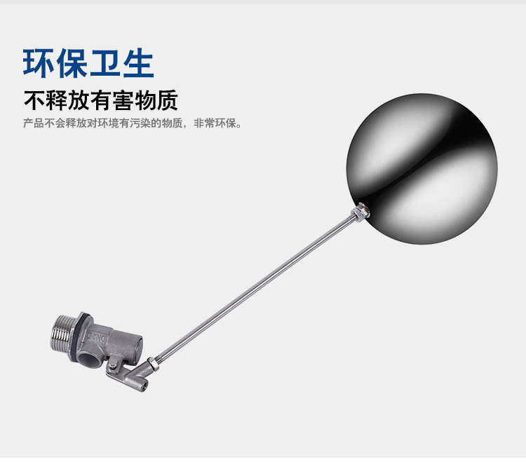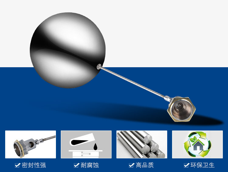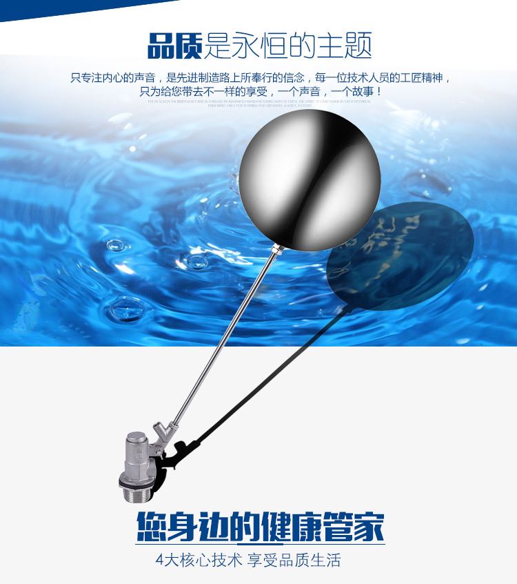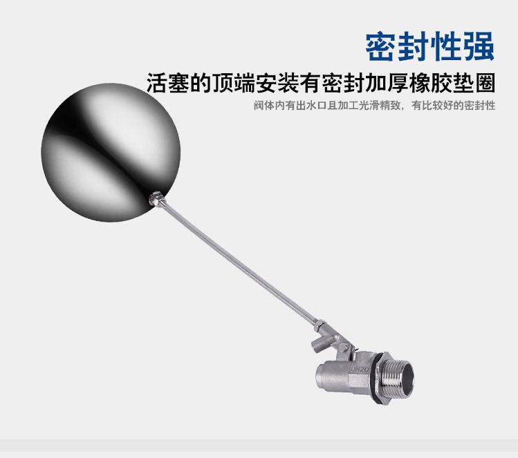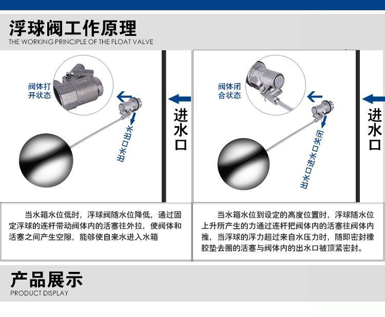 當(dāng)水塔內(nèi)水面下降時(shí),浮球下落,利用水管內(nèi)水的壓力,將閥體里的密封硅膠柱塞打開,閥體開啟供水,當(dāng)水塔水位上升時(shí),浮球上浮,連桿帶動(dòng)柱塞,硅膠體密封進(jìn)水孔,閥體停止供水.