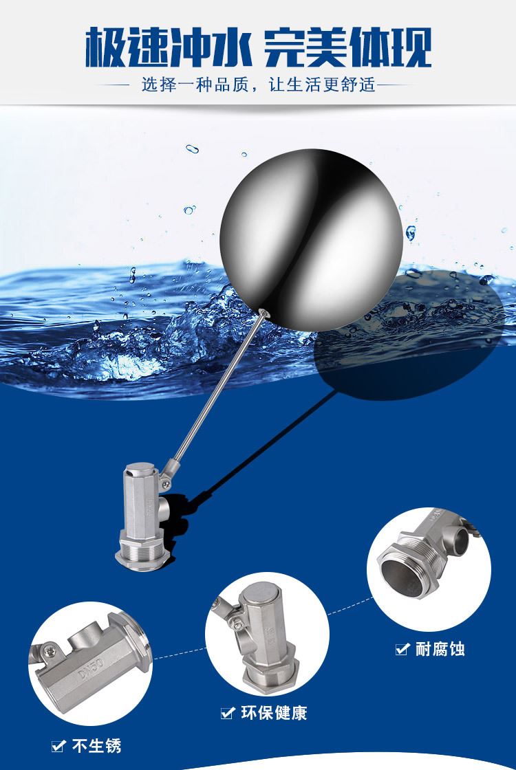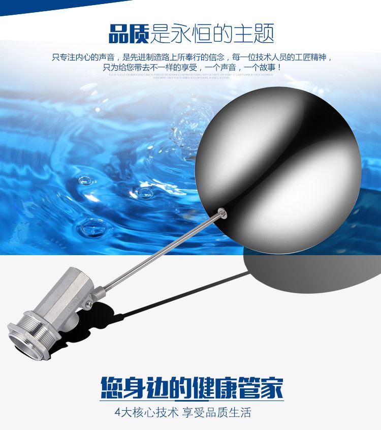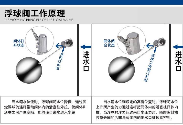 當(dāng)水塔內(nèi)水面下降時(shí),浮球下落,利用水管內(nèi)水的壓力,將閥體里的密封硅膠柱塞打開,閥體開啟供水,當(dāng)水塔水位上升時(shí),浮球上浮,連桿帶動(dòng)柱塞,硅膠體密封進(jìn)水孔,閥體停止供水.